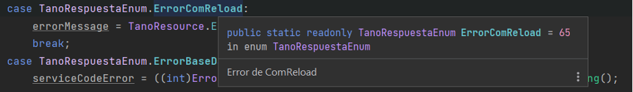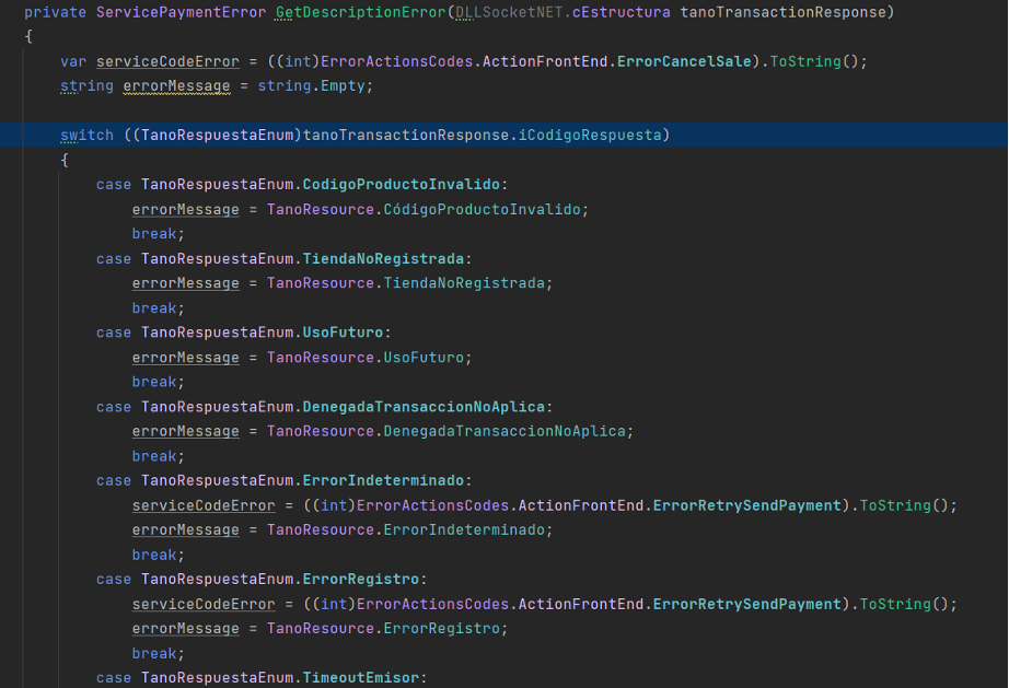 El método GetDescription mapea la respuesta de Tano con una Enumeracion que tiene los ocdigos de error: