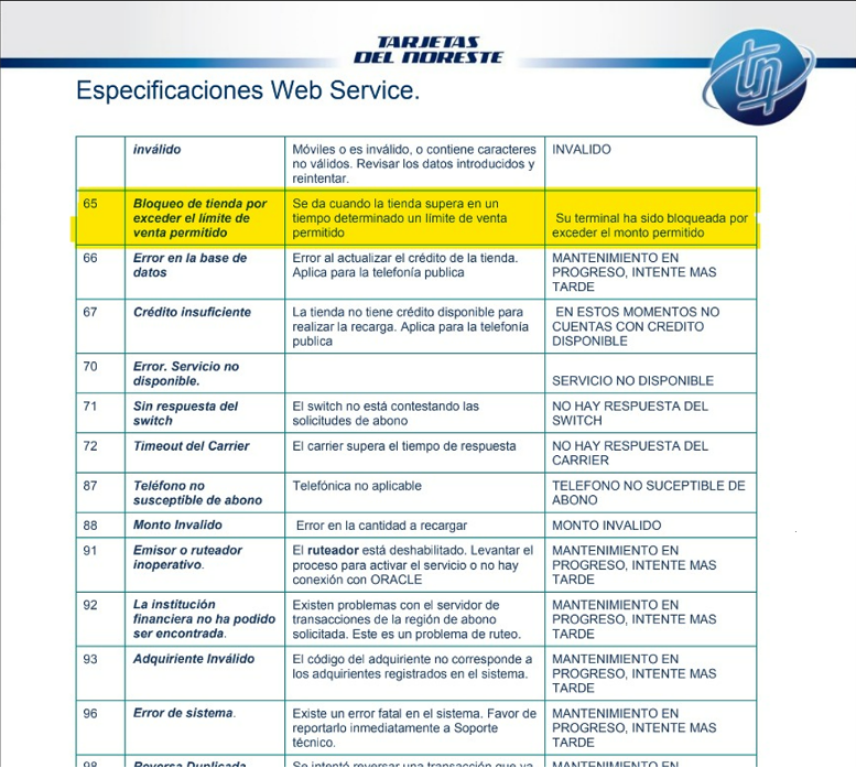 Paso 2.- Consultar  la especificación del webservice del servicio de Tano, aqui vemos que el código 65 es devuelto por Tano cuando la tienda supera en un tiempo determinado un imite de venta permitido.