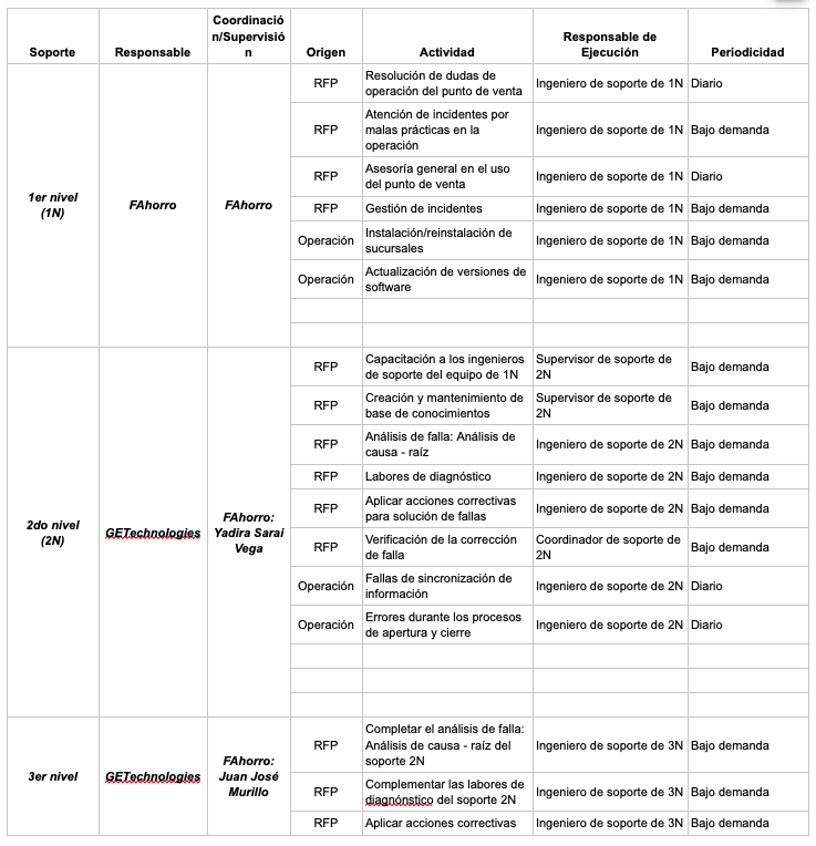 Para el soporte técnico de segundo nivel, se tiene contratado a un proveedor externo, en este caso GETechnologies. Dentro del equipo de segundo nivel se encuentran los siguientes perfiles: Lider Sr., Ingenieros de soporte, Analista de soporte, Desarrollador e Ingeniero de datos.