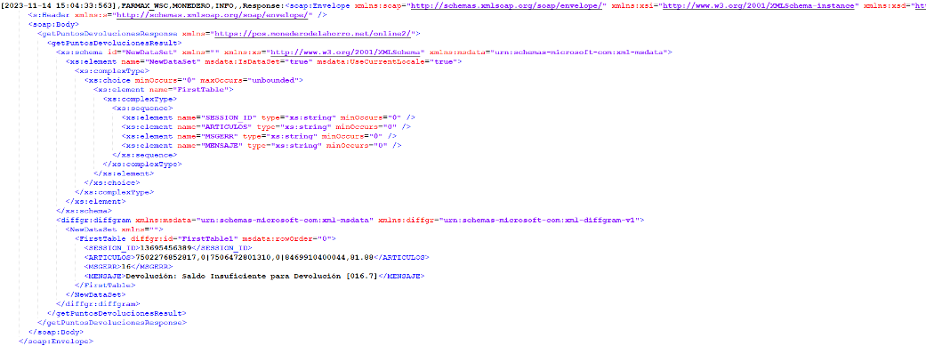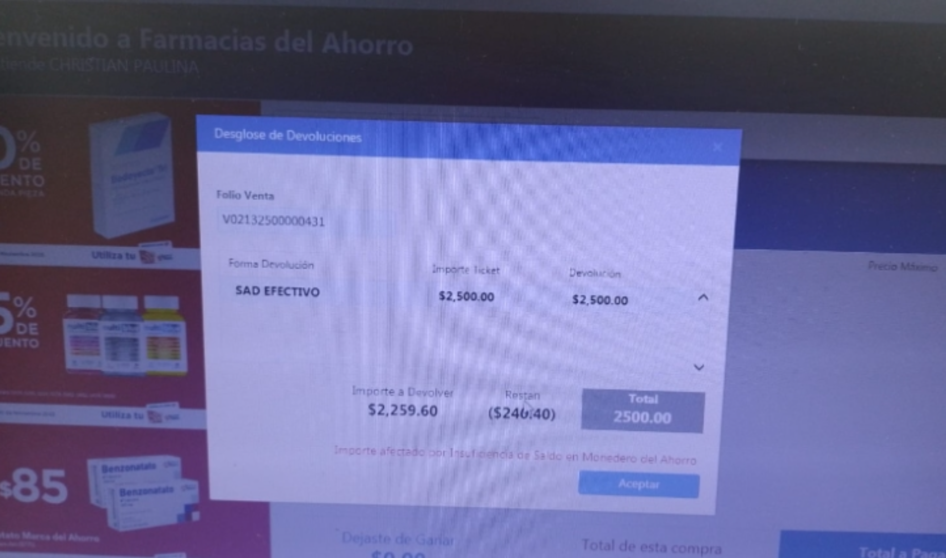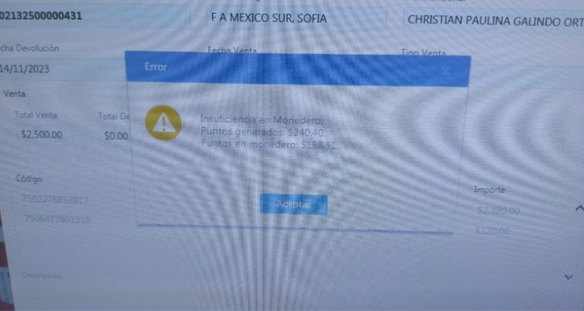 Se busca realizar una devolución pero saldo del monedero es insuficiente para poder devolver los puntos que se le otorgaron al momento de la compra. Se presenta mensaje en pantalla
