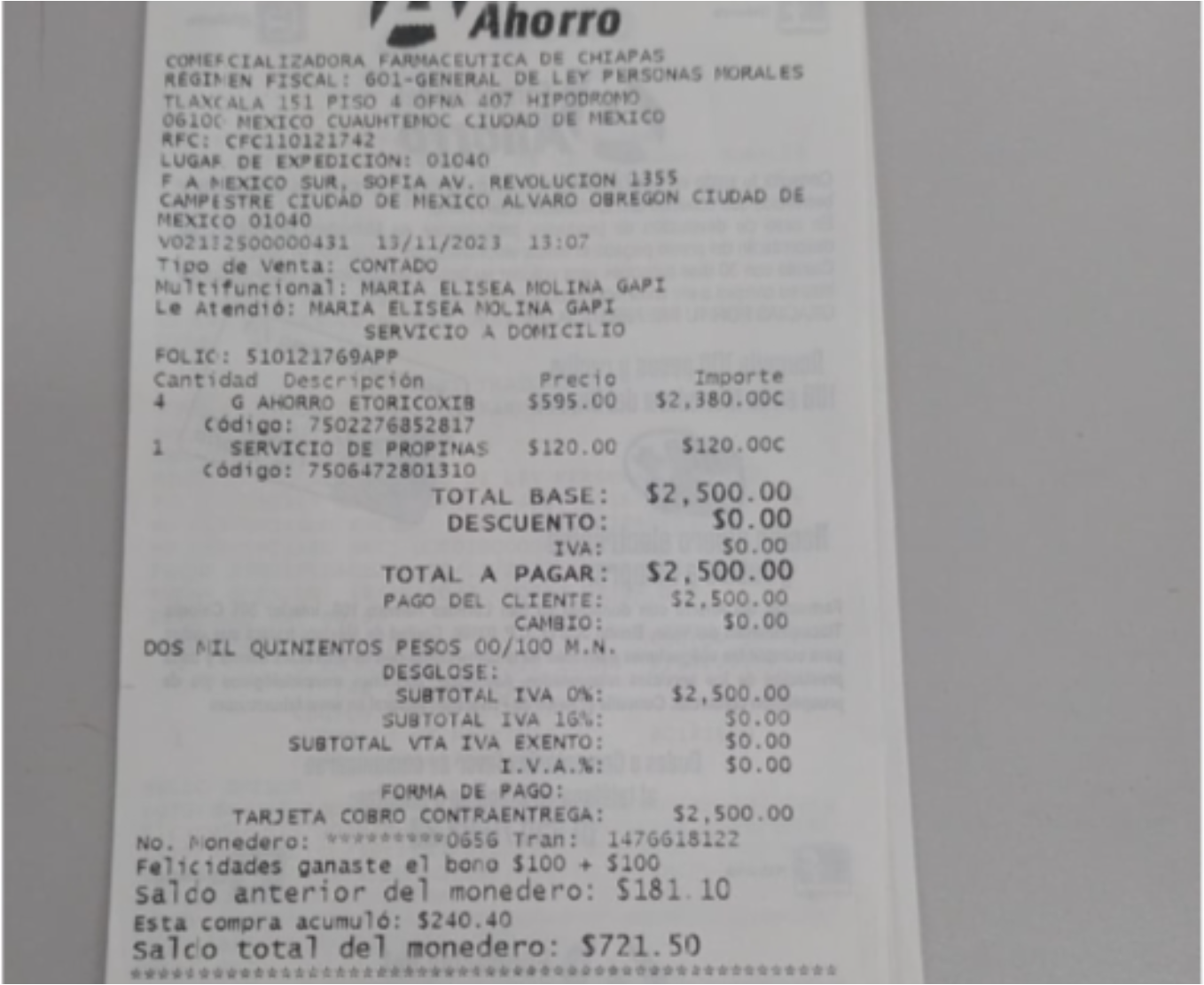 Al día siguiente se hizo una compra de $1,187 y se pagó con el monedero, quedando un saldo de $158.51 en el monedero.