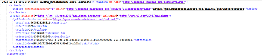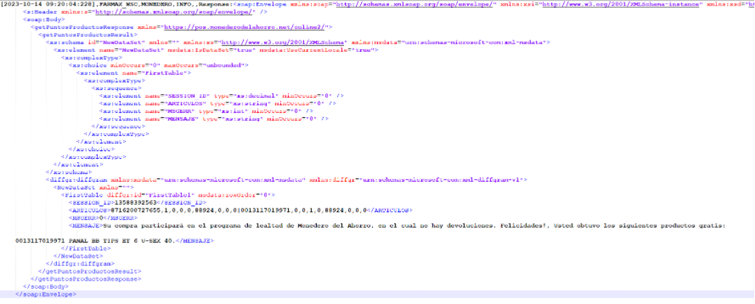 Paso 1.- Revisamos los archivos logs del monedero 20231014_FARMAX_WSC_MONEDERO.XLOG para revisar las operaciones del monedero 9600336238811, y vemos que si se obtuvo un producto gratis.